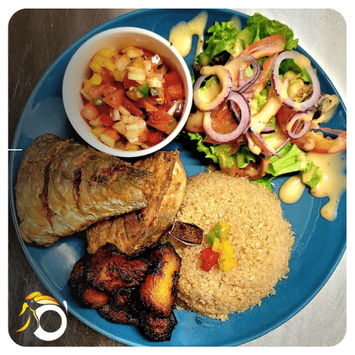Thon frit selon la disponibilité (Filet ou darne), attiéké, allocos, salade avec sa sauce vierge.