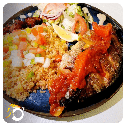 Un délicieux poisson braisé ou frit, accompagné d’attiéké (semoule de manioc cuite à la vapeur), de légumes arc-en-ciel, d’alloco, et d’une salade fraîche avec sa sauce maison. Une expérience culinaire aux saveurs africaines authentiques.