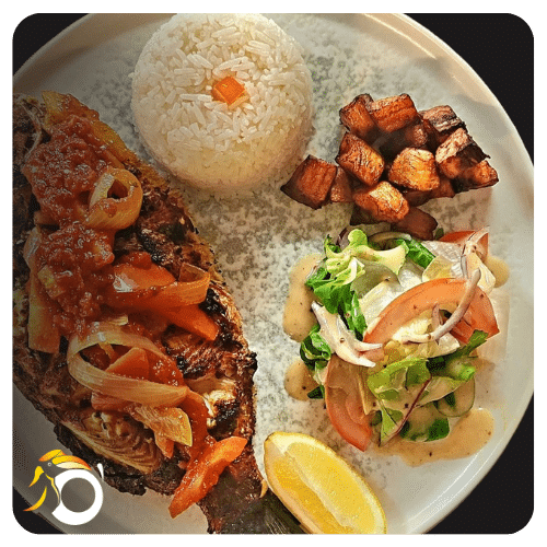 Un poisson braisé ou frit, accompagné de riz blanc, frites ou alloco, avec salade et une sauce riche en saveurs. Un plat parfait pour les amateurs de fruits de mer.